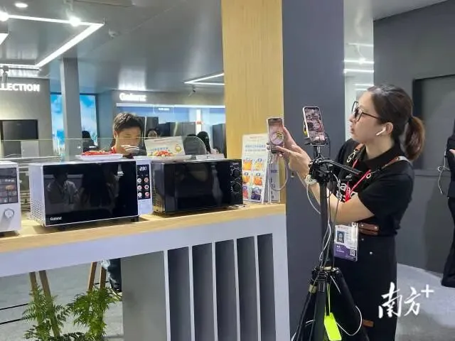 在格兰仕展位,业务员正在同步直播新品。