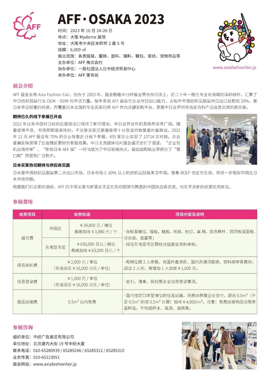 为满足企业的参展需求,经主办方认真研究、努力协调,“第 39 届 AFF·大阪展”将于 10 月 24-26 日在日本大阪MYDOME 展馆正常举办。欢迎报名参展!