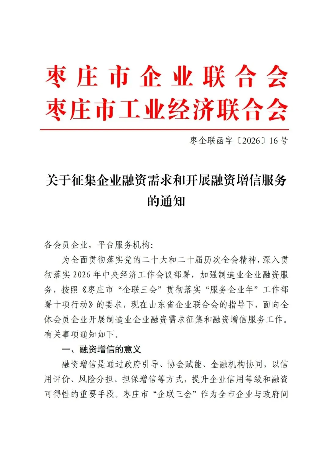 为全面贯彻落实党的二十大和二十届历次全会精神,深入贯彻落实2026年中央经济工作会议部署,加强制造业企业融资服务,按照《枣庄市“企联三会”贯彻落实“服务企业年”工作部署十项行动》的要求,现在山东省企业联合会的指导下,面向全体会员企业开展制造业企业融资需求征集和融资增信服务工作。有关事项通知如下。