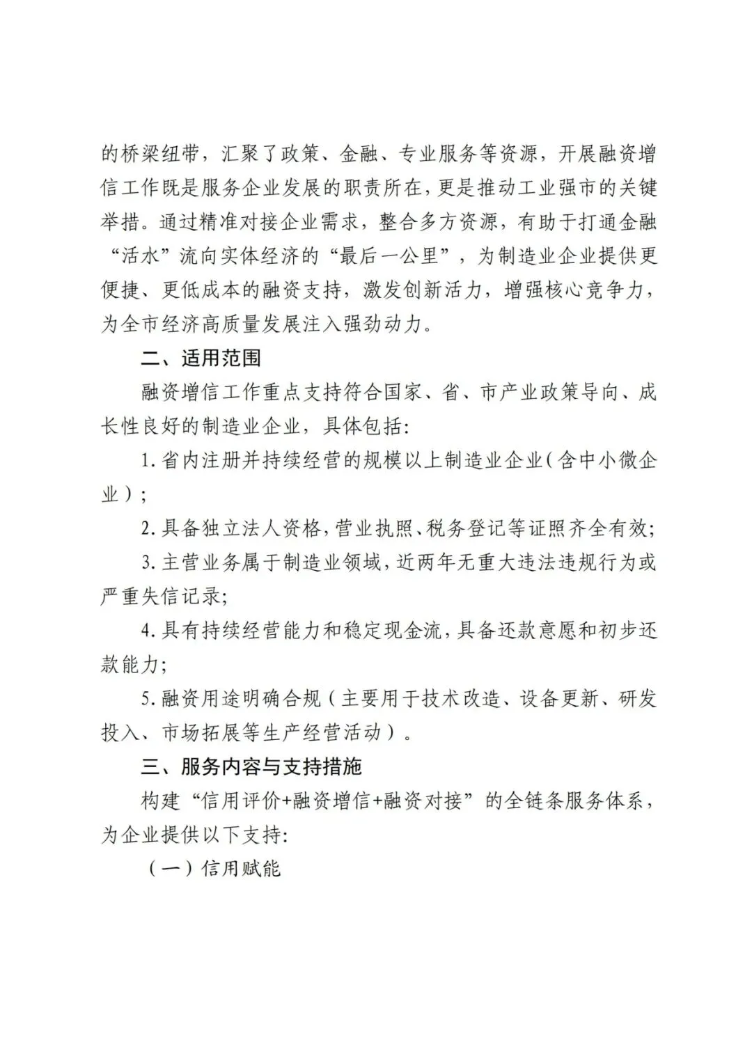 融资增信工作重点支持符合国家、省、市产业政策导向、成长性良好的制造业企业,具体包括: