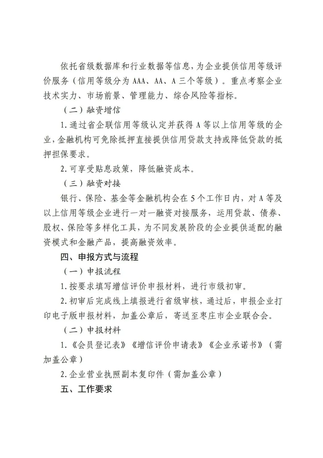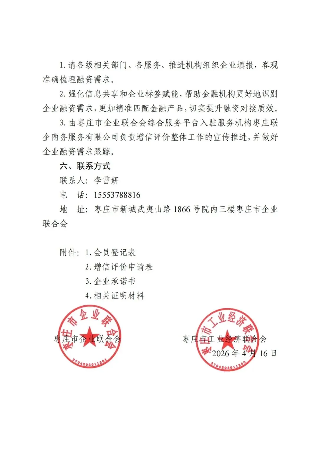 3.由枣庄市企业联合会综合服务平台入驻服务机构枣庄联企商务服务有限公司负责增信评价整体工作的宣传推进,并做好企业融资需求跟踪。