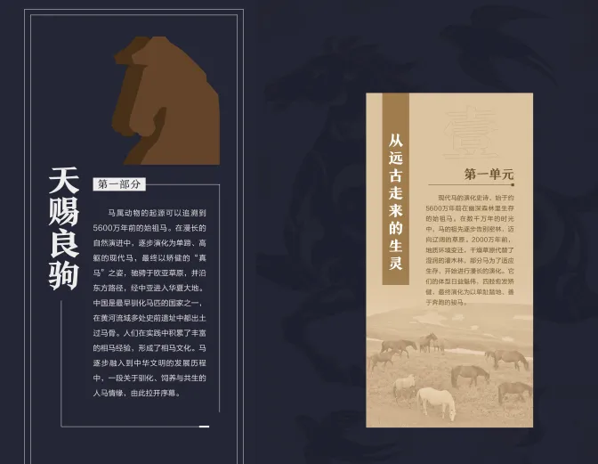 马属动物的起源可以追溯到5600万年前的始祖马。中国是最早驯化马匹的国家之一,在黄河流域多处史前遗址中都出土过马骨。人们在实践中积累了丰富的相马经验,形成了相马文化。马逐步融入到中华文明的发展历程中,一段关于驯化、饲养与共生的人马情缘,由此拉开序幕。