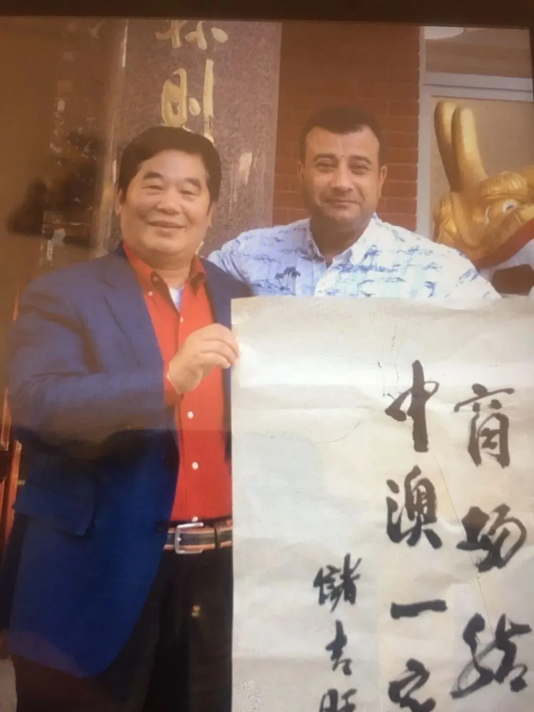 照片里,两个人都还是一头黑发的模样。储吉旺穿一件红衬衫,外套深蓝色西装;Medhat穿着热带风情的花衬衫,一只手搭在储吉旺肩上。两人一起举着一幅字,上面写着——