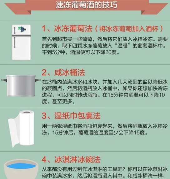 用冰冻葡萄的方式可以让葡萄酒在5分钟之内就葡萄酒的温度降到20℃,最后要记得用干净的工具将葡萄捞出来再开喝。