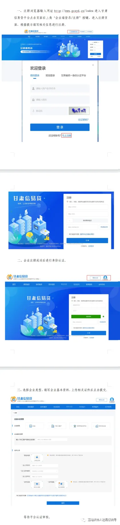 “信易贷”是由政府部门牵头,金融机构和其他市场主体共同参与、共担风险,以提升风险管理能力为立足点,减少对抵质押担保的过度依赖,逐步提高中小微企业贷款中信用贷款的占比。鼓励金融机构对信用良好、正常经营的中小微企业创新续贷方式,切实降低企业贷款周转成本,助推解决中小微企业融资难问题,营造“守信有益、信用有价”的良好氛围。甘肃信易贷”平台是省发展改革委依托省社会信用信息平台开发建设,着力解决中小企业融资难、融资贵、融资慢等困难问题,为各类市场主体提供融资综合信用服务,各市场主体可通过平台发布融资需求,平台根据需求智能匹配符合的金融产品,市场主体也可与金融机构直接在平台进行对接,获取信贷支持。各项操作均在互联网进行,免去企业在银行间的来回奔波。1.政府主导,更安全,更高效。全面整合不同政府部门信息资源,形成产融大数据,自动匹配融资需求、信息、产品、正规机构信贷经理。2.合法金融机构多、融资方法多。银行、小贷、证券等多种金融机构入驻,多样化选择满足个性化需求。3.操作简单,融资快捷。减少人工录入,分分钟发布融资需求;金融机构实时接收信息,在线完成对接,高效快捷。(一)扫描“甘肃省信易贷”小程序码进行注册“甘肃信易贷http://www.gsxyd.cn/index网页版进行注册,具体步骤如下图所示:显示企业信息已绑定认证、已实名认证,就可以正常使用了,广大商户企业快来体验吧!