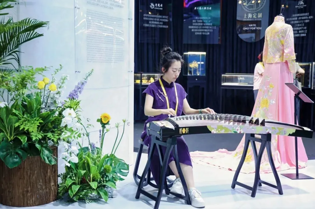上海市担任本届消博会主宾省,以“爱购上海 I GO ShangHai”为主题打造形象展区,集中展示上海国际消费中心城市建设成果,立体呈现一个可感、可知、可借鉴的生动范本。“敦煌”作为扎根上海的中华老字号企业,携蝶花并蒂古筝精彩亮相,以匠心工艺与东方美学,为上海展区增添一抹独特的国乐风华。