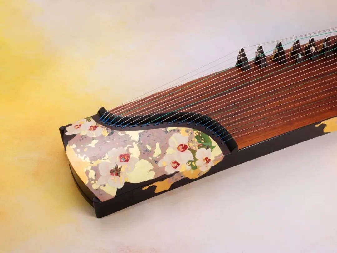蝶花并蒂古筝采用福州大漆髹饰技艺和蛋壳工艺制作,不规则笔触如墨色在宣纸上恣意洇散,如同穿花蝴蝶的掠影。蝴蝶兰的金边花瓣拂过斑驳漆面,光影在凹凸的漆彩间跳跃。传统大漆工艺与现代艺术碰撞,创造了可演奏的漆艺珍藏,让弹奏的每个音符都包裹着东方美学的光影,让传统文脉在现代琴弦上绽放。