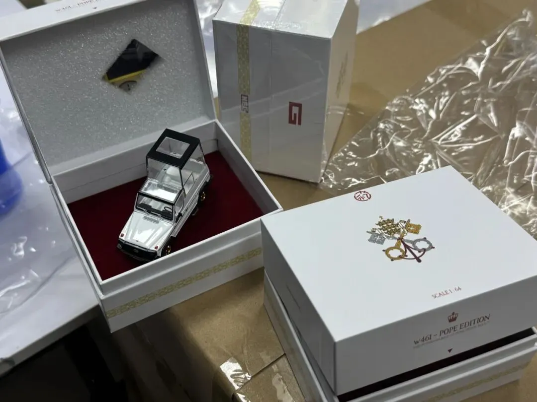 细节精准复刻:1:1 还原教皇大 G 标志性透明座舱,中网内置风扇细节、梵蒂冈专属标识等实车特征完整呈现,内饰布局、方向盘等细节一一到位。