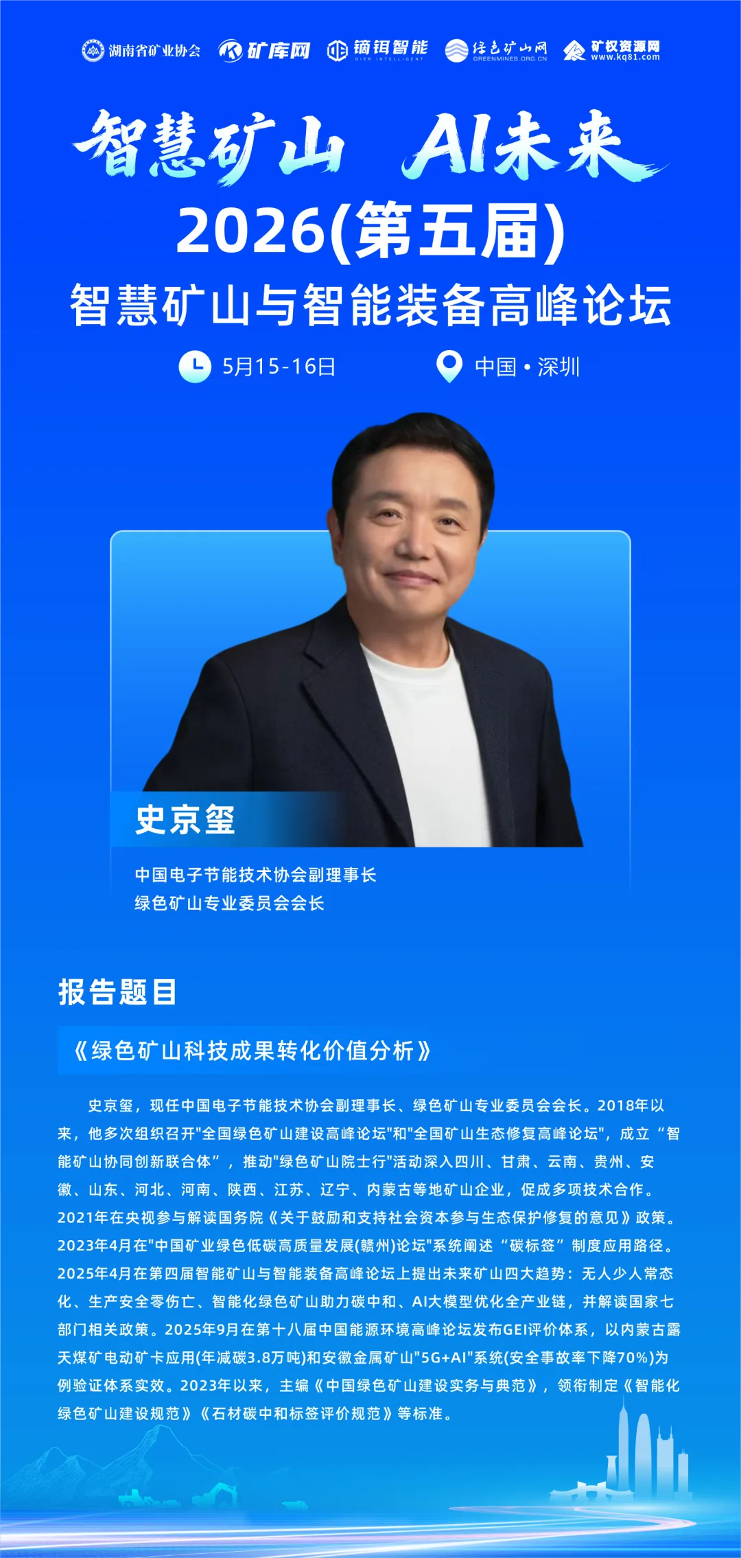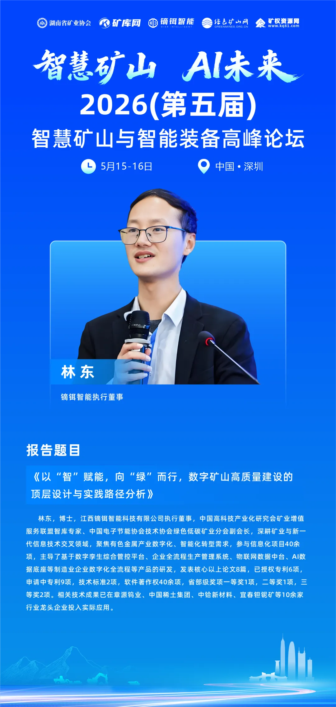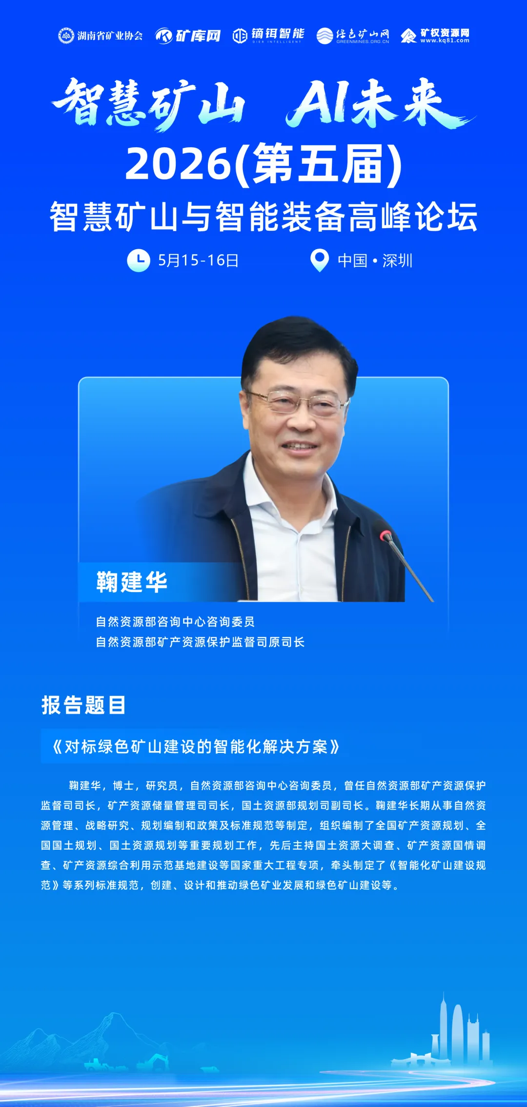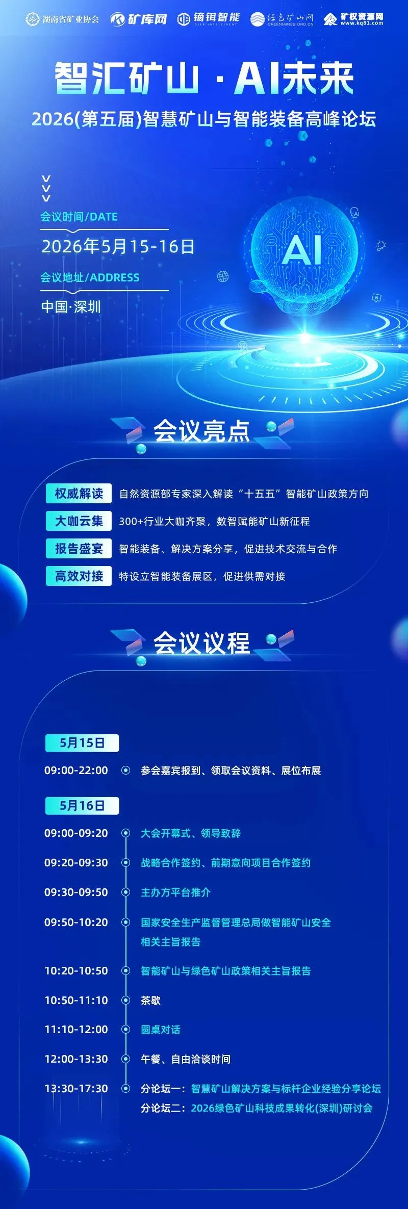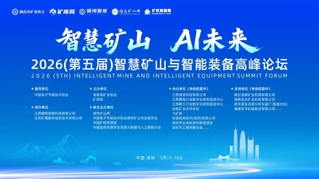 当前,人工智能、数字孪生、5G+工业互联网、绿色低碳等前沿技术正加速在矿山场景中深度融合应用,有力驱动着矿山产业朝着“无人化、智能化、绿色化”的方向加速转型升级。为进一步促进行业间的深度交流与技术融合,搭建智慧矿山生态合作的高效平台,湖南省矿业协会、矿库网、绿色矿山网、中国矿权资源网、中国自然资源学会资源大数据与人工智能分会计划于2026年5月15日至16日在深圳举办《智汇矿山·AI未来:2026(第五届)智慧矿山与智能装备高峰论坛》。