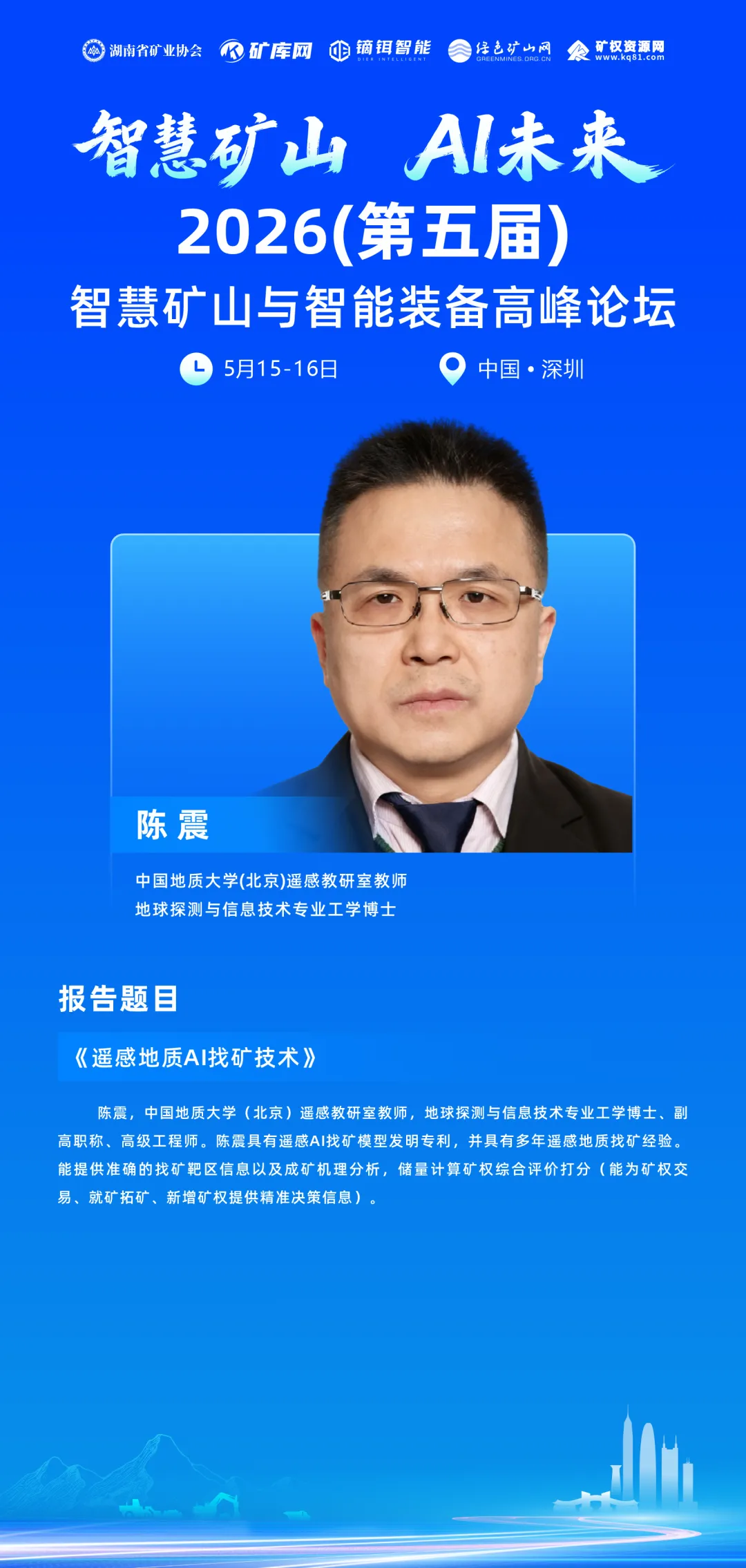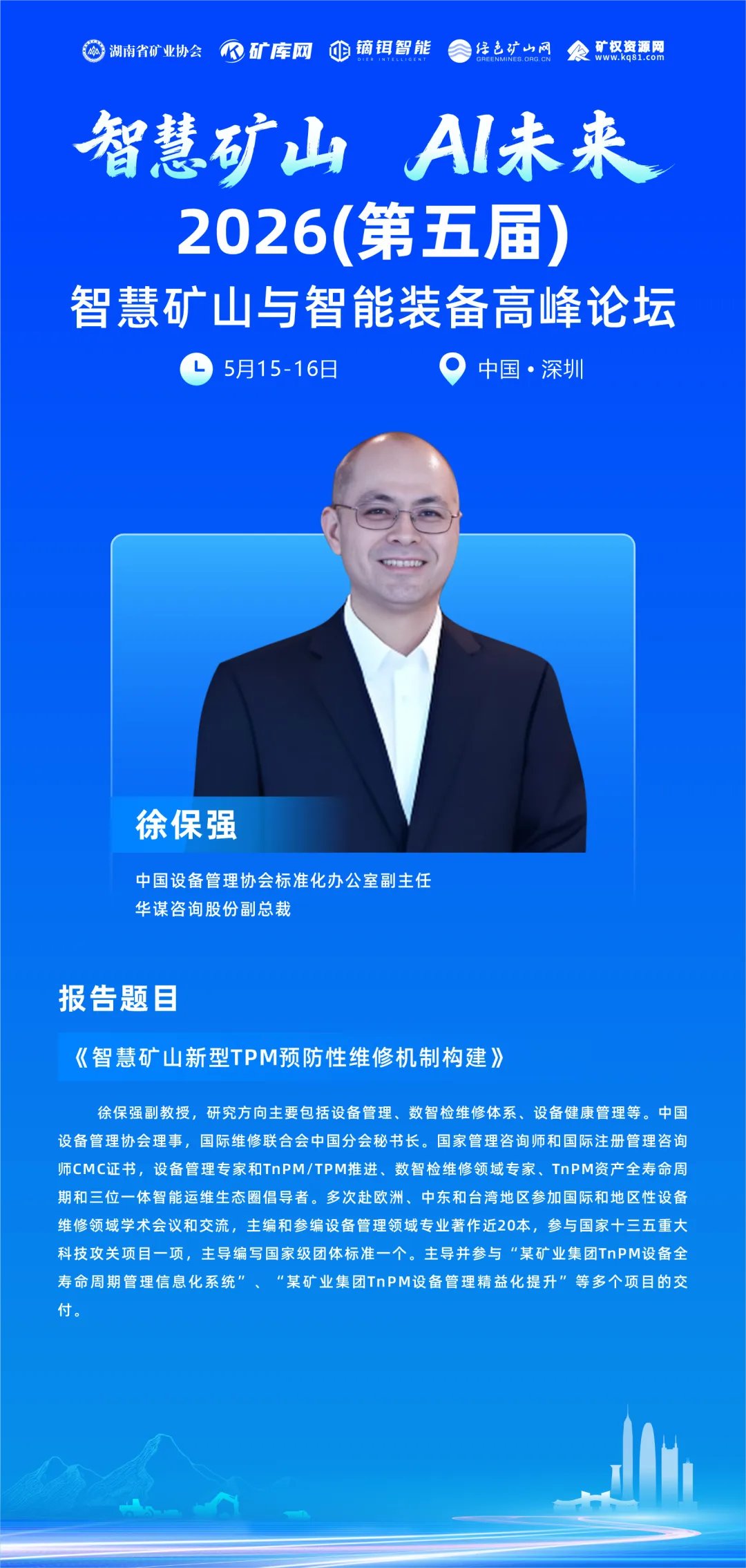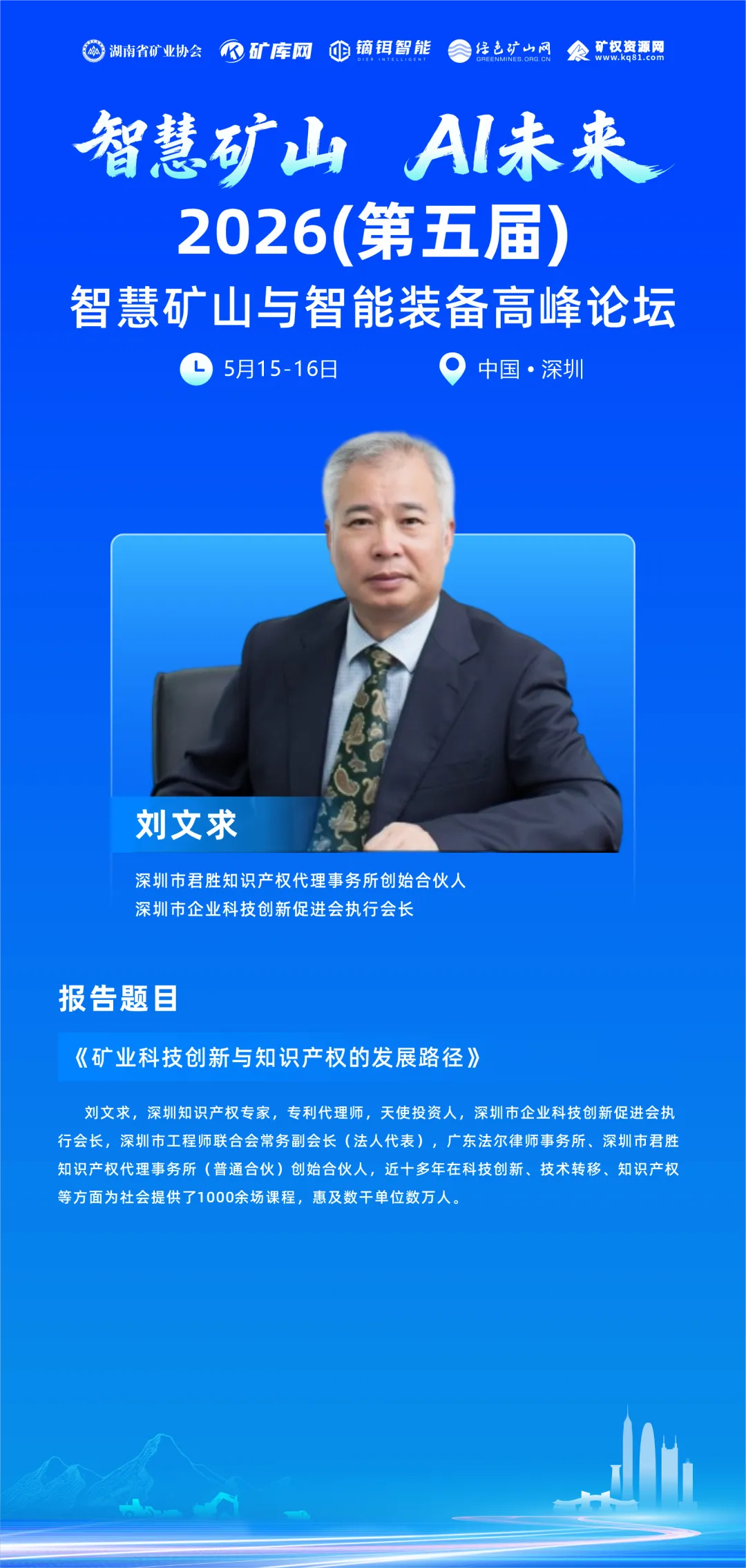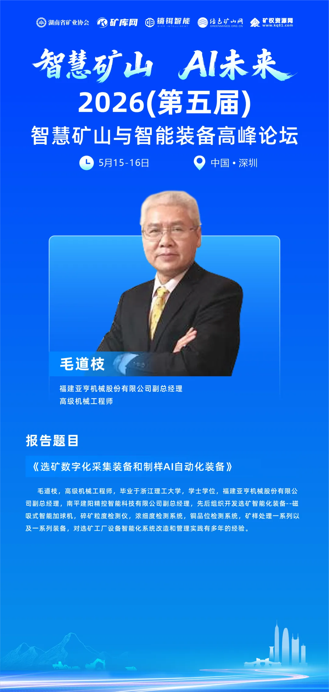 当前,人工智能、数字孪生、5G+工业互联网、绿色低碳等前沿技术正加速在矿山场景中深度融合应用,有力驱动着矿山产业朝着“无人化、智能化、绿色化”的方向加速转型升级。为进一步促进行业间的深度交流与技术融合,搭建智慧矿山生态合作的高效平台,湖南省矿业协会、矿库网、绿色矿山网、中国矿权资源网、中国自然资源学会资源大数据与人工智能分会计划于2026年5月15日至16日在深圳举办《智汇矿山·AI未来:2026(第五届)智慧矿山与智能装备高峰论坛》。