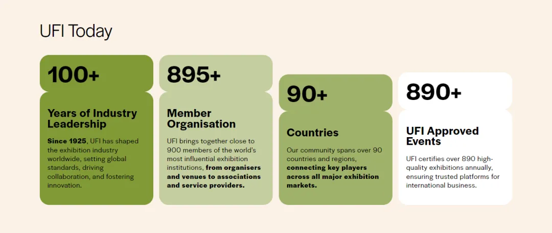 截至目前,UFI 在全球 90 多个国家与地区拥有近 900 家会员机构,每年认证高品质展会超 890 场。
