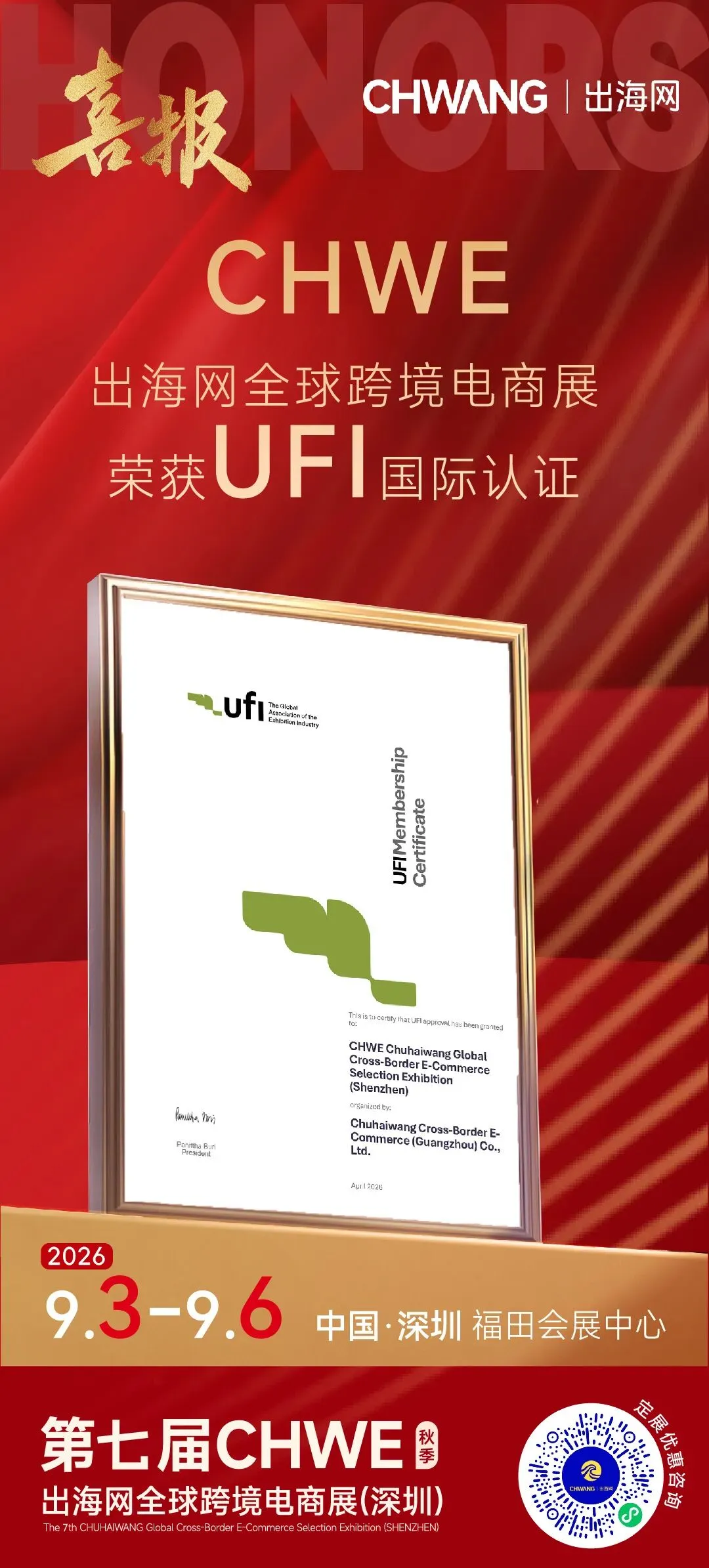 近日,CHWE 出海网全球跨境电商展正式通过全球展览业协会(UFI)权威认证,标志着展会在规模实力、专业品质、服务标准、国际化运营等方面,获得全球会展业最高标准认可,跨境电商领域再添一枚国际金质勋章!