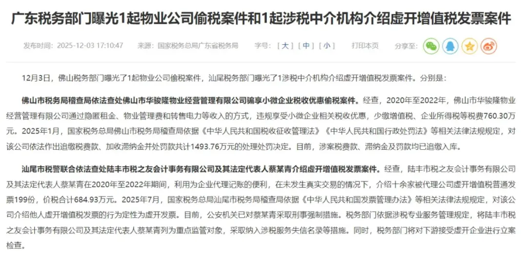 经佛山市税务局稽查局依法查明,2020年至2022年,佛山市某物业经营管理有限公司通过隐匿租金、物业管理费和转售电力等收入的方式,违规享受小微企业相关税收优惠,少缴增值税、企业所得税等税费760.30万元。