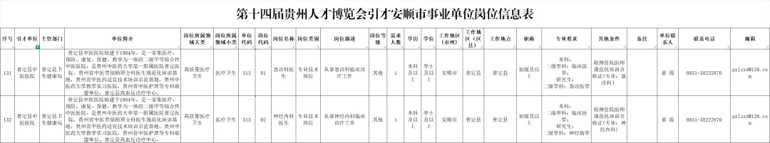 为深入实施新时代人才强市战略,安顺市拟于2026年4月25日-26日组团参加省委、省政府举办的第十四届贵州人才博览会(以下简称“第十四届人博会”),借助引才平台,推进安顺人才大汇聚。其中,普定县中医医院将引进急诊及神经内科专业技术人员2名。
