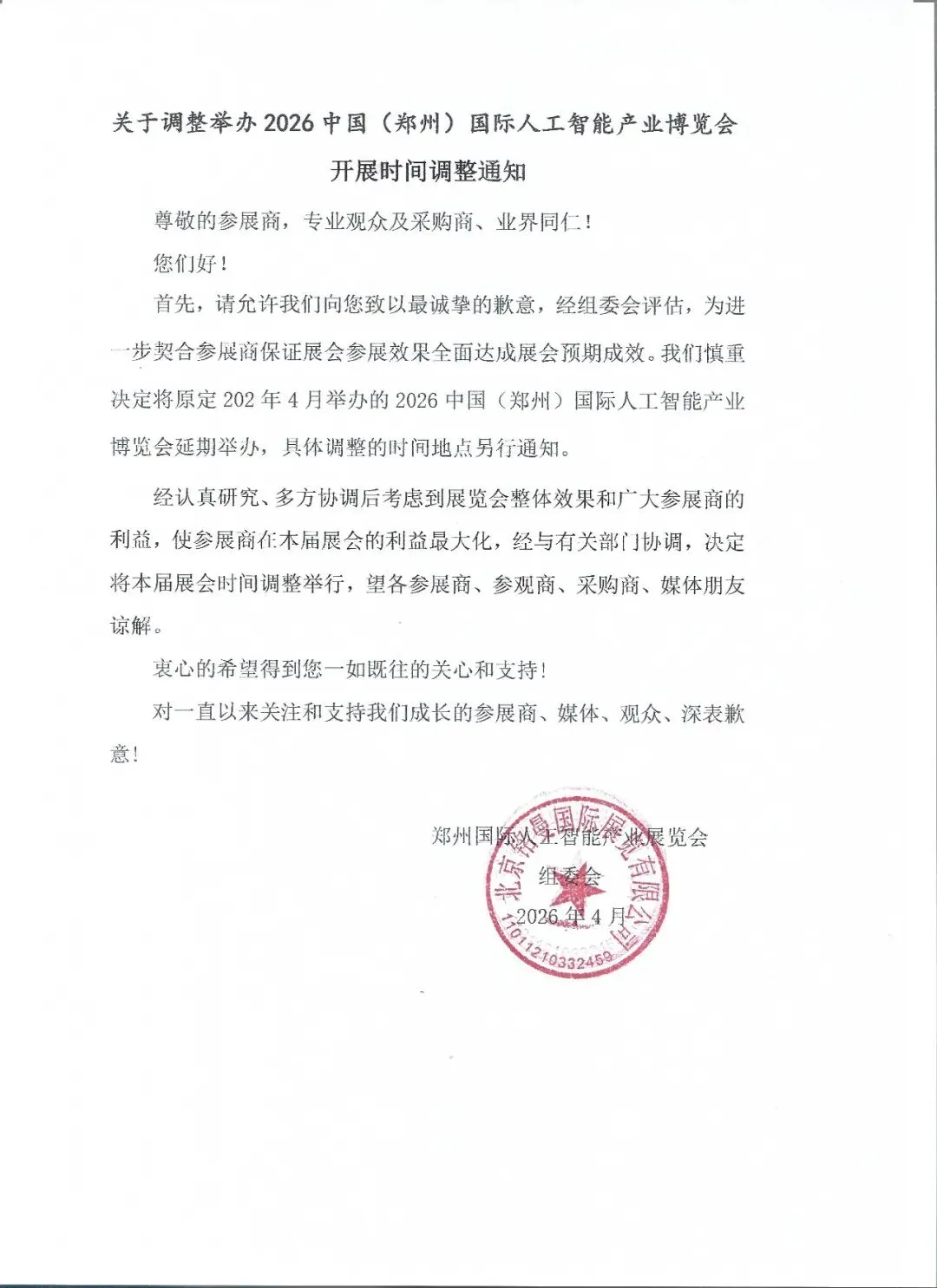会展资讯丨2026中国(郑州)国际人工智能产业博览会开展时间调整通知