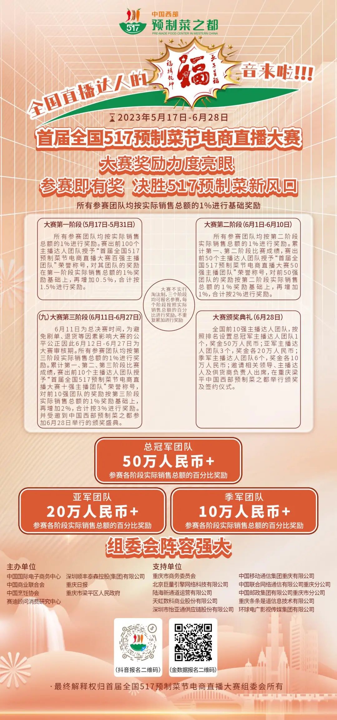 无法亲自前往梁平品尝预制美食的网友,也可以直接抖音搜索#517预制菜#,关注正在举行的首届全国517预制菜节电商直播大赛,如果你也有带货兴趣,还可参与比赛,赢取终极大奖。如果你是吃货,更可以进入直播间尽情嗨购,把麻辣鲜香、回味无穷的预制菜一一尝遍。