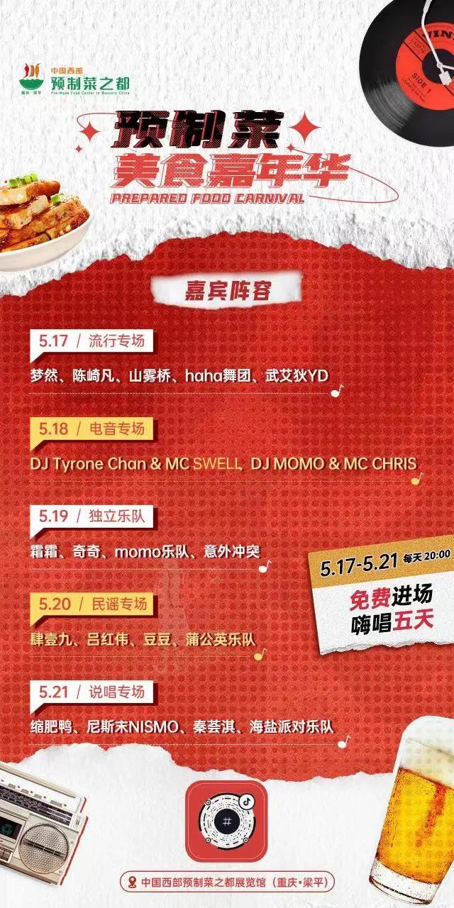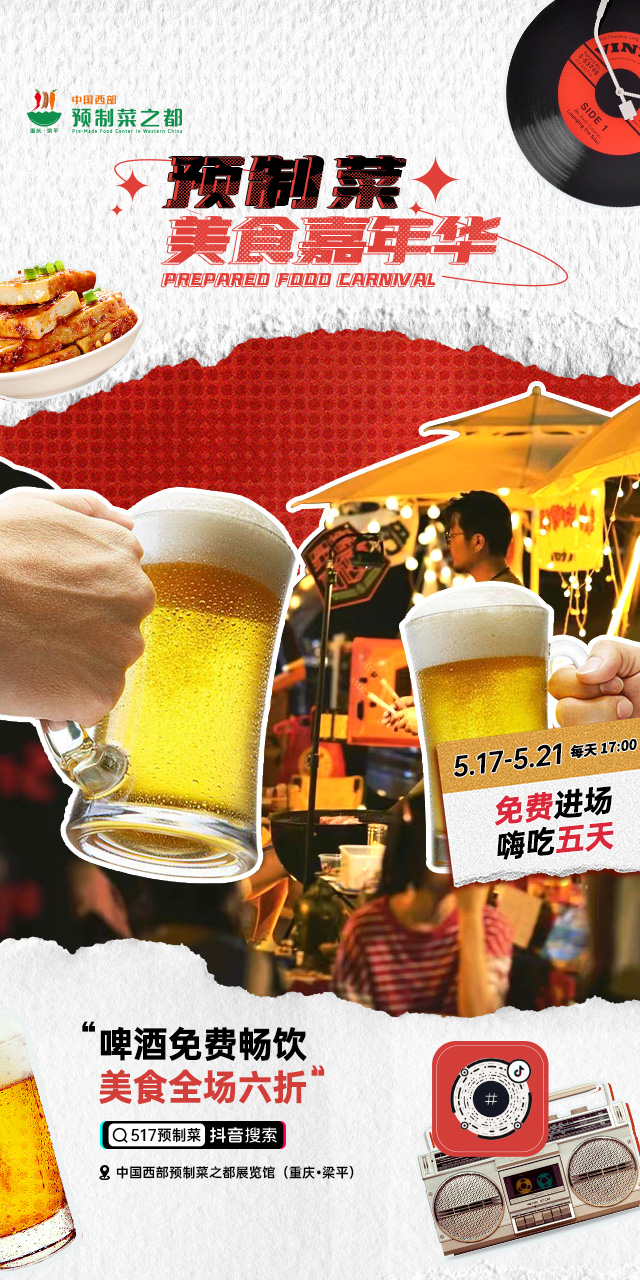 寻味重庆ke梁平,尝遍中国每一味。汇集了音乐、啤酒、预制菜“灵魂新三样”的517预制菜节系列活动,即将在中国西部预制菜之都重庆梁平启幕。届时整个中国西部预制菜展览馆园区,都将打造为大型美食街区。“预制菜美食嘉年华”活动从5月17日至21日连续5天在街区上演,音乐会、啤酒畅饮、美食集市等场景互动,免费邀约市民游客前往游玩。