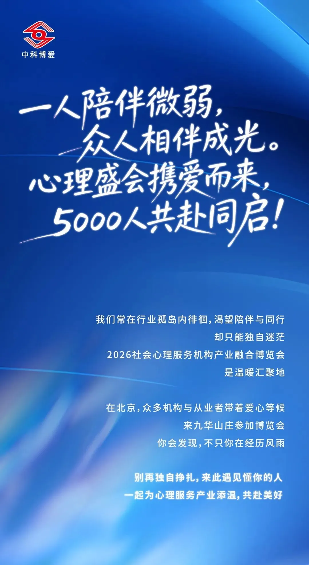 本次博览会由中科博爱(北京)心理医学研究院联合国内多家知名心理服务机构与行业领军人物共同主办,主题定为:智领未来·互助成长·融合发展。其中老年人心理关怀赋能分论坛聚焦老年心理适应、情感陪伴、认知维护,将成为破解银发心理需求、落地积极老龄化的重要阵地。