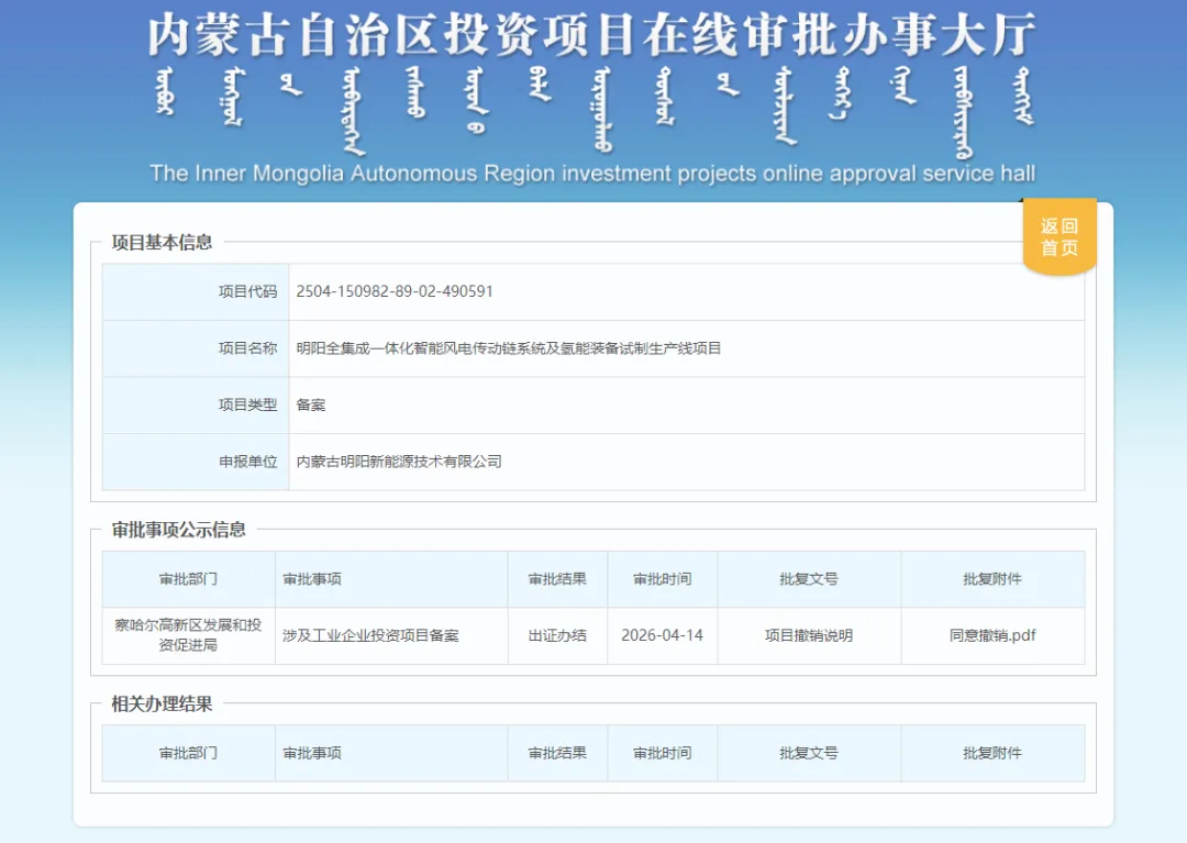 明阳全集成一体化智能风电传动链系统及氢能装备试制生产线项目同意撤销。