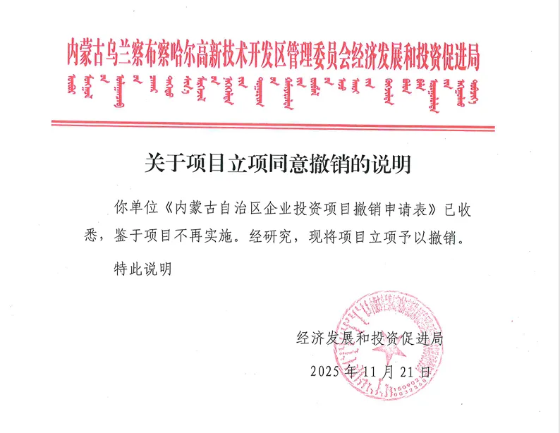 内蒙古乌兰察布察哈尔高新技术开发区管理委员会经济发展和投资促进局发布的关于项目立项同意撤销的说明显示,“鉴于项目不再实施。经研究,现将项目立项予以撤销”。
