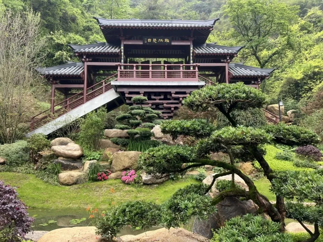 循着潺潺水声,林涧山溪映入眼帘。临水而建的高台榭是园中核心建筑,其灵感直接来源于徐州汉画像石中的“双梯高台榭”形象,多层叠落的斗拱与护斗层层抬升,既忠实还原汉代斗拱之美,又以现代结构技术予以再现。