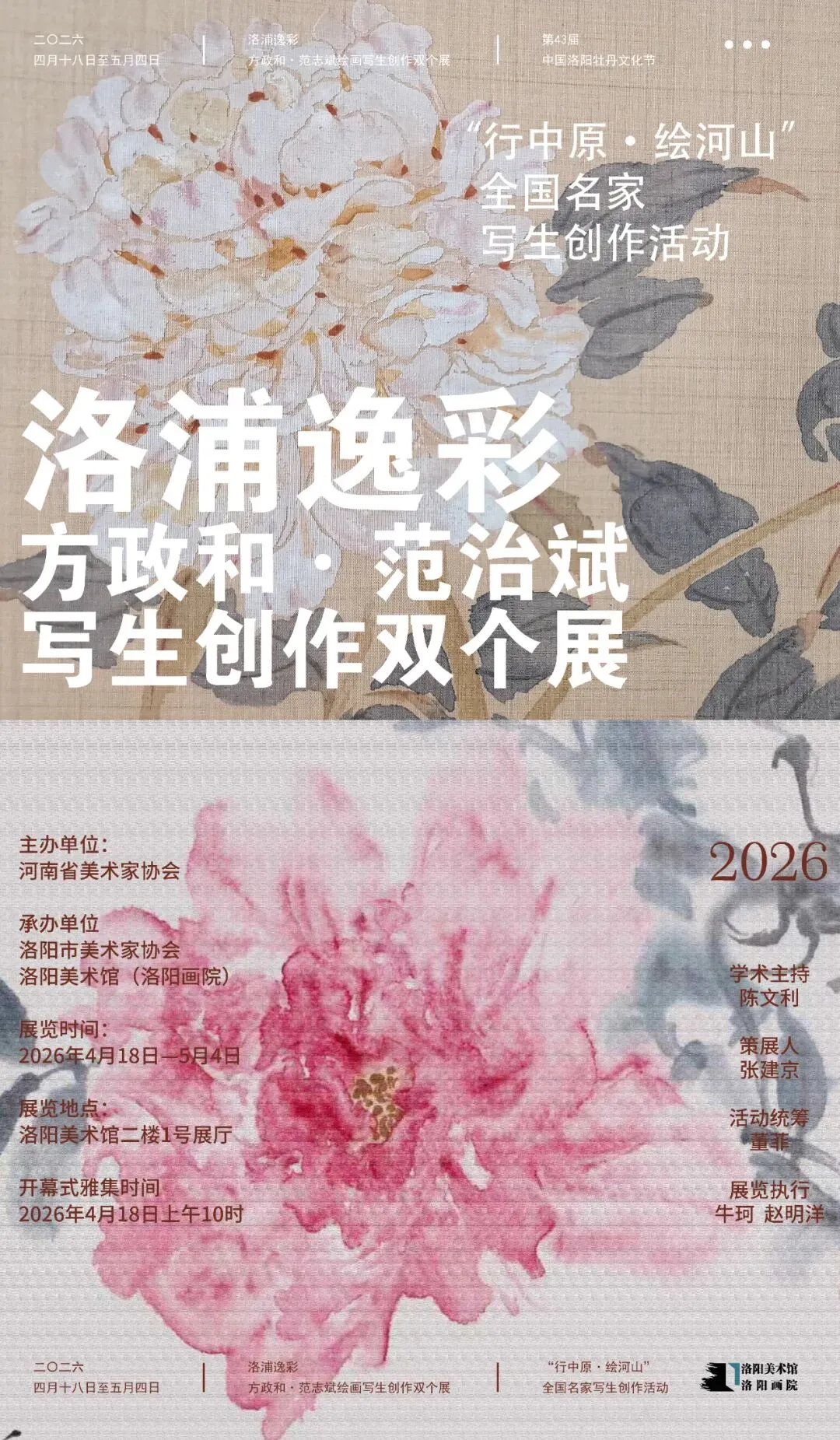丙午春和,牡丹缀城。“洛浦逸彩,墨韵中原——方政和·范治斌绘画写生创作双个展”如期绽放。本次展览作为“行中原·绘河山”全国美术名家写生创作活动的组成部分,由河南省美术家协会主办,洛阳市美术家协会、洛阳美术馆(洛阳画院)承办,荟集二位艺术家中原写生佳作及近年创作精品约50幅,以工写相济、古今相融的笔墨语言,对话河洛文脉,抒写山河情怀,为古都洛阳献上一场兼具底蕴与新意的水墨雅赏。