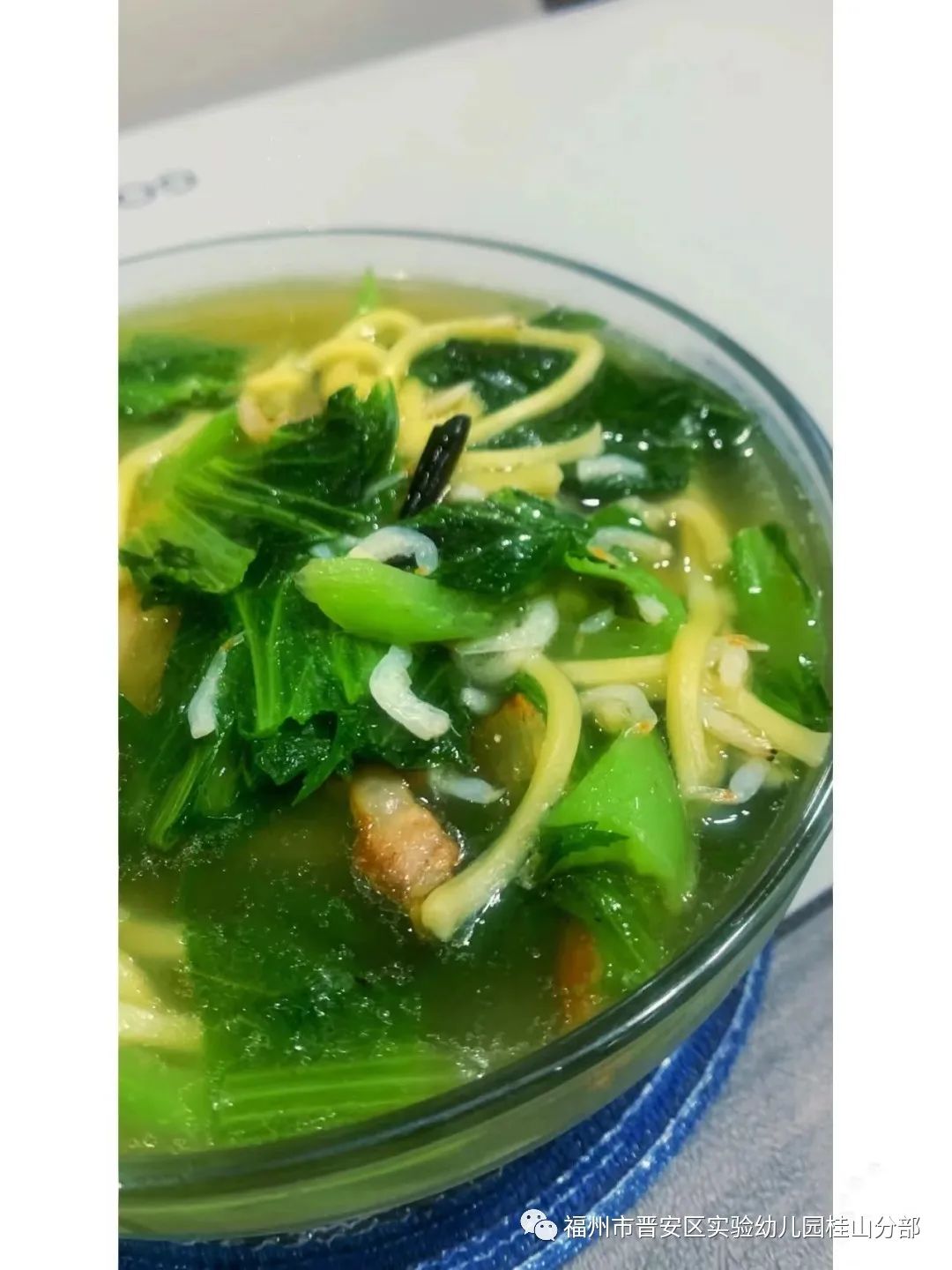 小芥菜虾皮海鲜肉末鸡蛋面、干锅包菜、肉松饭团