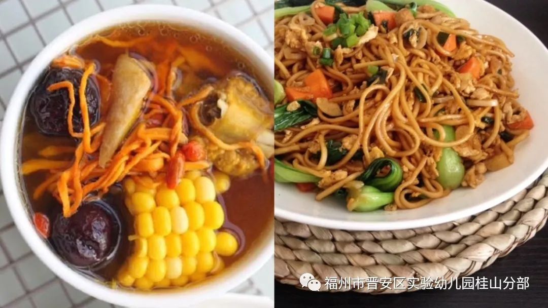 三鲜肉末蔬菜炒面、玉米排骨虫草花汤、胡萝卜炒花菜