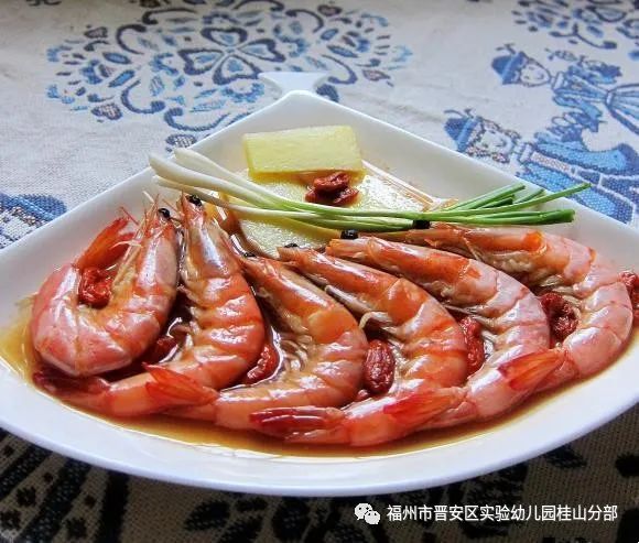 软饭、枸杞虾、鸡蛋炒丝瓜、红烧狮子头