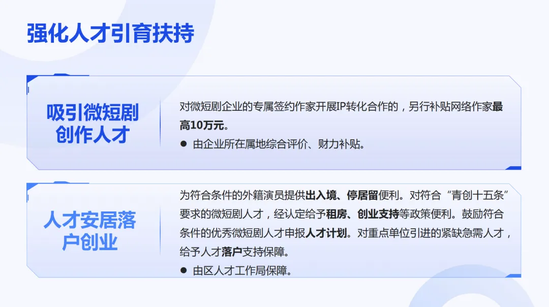 承诺为外籍演员提供停居留便利,为青年人才解决租房、创业、落户等后顾之忧,并保障微短剧企业入驻产业基地可享前三年租金优惠。