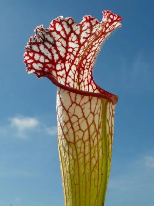 来自美洲大陆沼泽地带的瓶子草因外形与猪笼草相似却分属不同科属而备受关注。它的叶片呈现“分工合作”模式:一部分是正常的剑形叶,负责光合作用制造有机物;另一部分则特化为筒状的“捕虫瓶”,专职捕猎。这些“瓶子”色彩艳丽,有的呈鲜红带斑纹,有的泛着淡绿荧光,还会根据种类不同散发紫罗兰香或水果甜味。昆虫被视觉与嗅觉双重信号吸引,一旦飞入“瓶”内,就会被内壁向下生长的细密倒毛挡住退路——这些倒毛柔软且方向单一,昆虫往上爬时会不断打滑,最终落入瓶底的消化液中。有趣的是,部分瓶子草自身不分泌消化酶,而是与蚊子幼虫、细菌形成共生关系:蚊子幼虫以落入瓶中的昆虫为食,其排泄物经细菌分解后,便成为瓶子草可吸收的“营养餐”,实现了三方共赢。