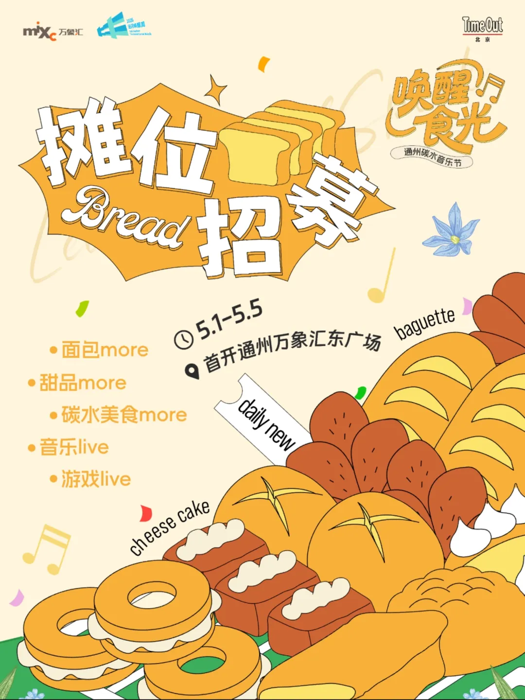 5月1日-5日,首开通州万象汇东广场,面包、甜品、碳水美食集结,更有音乐live、游戏live嗨翻全场!用香气唤醒味蕾,用旋律点燃热爱,承包你整个五一的快乐!美食摊主速来,一起打造碳水爱好者的狂欢盛宴