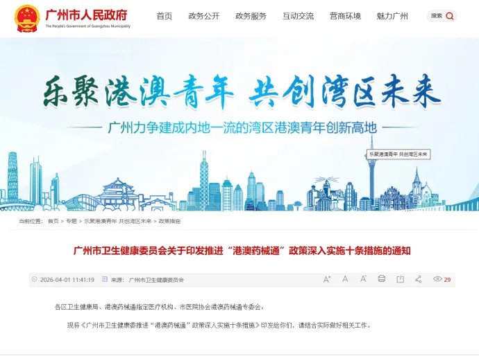 尤其值得注意的是,文件明确提出,联合港澳相关行业协会及重点医疗机构,建立常态化穗港澳三地协作机制。这意味着,“港澳药械通”已不再只是一个便利创新药械进入临床使用的政策工具,而是在更深层面上服务于穗港澳医疗协同和跨境医疗资源对接。