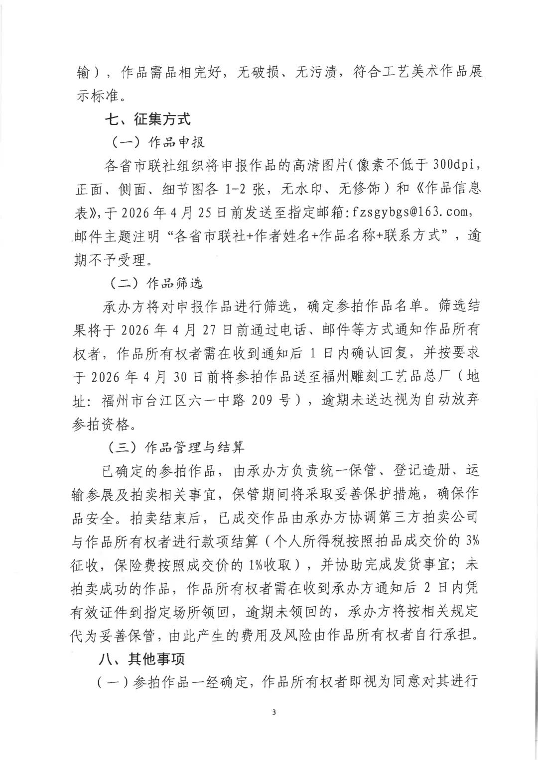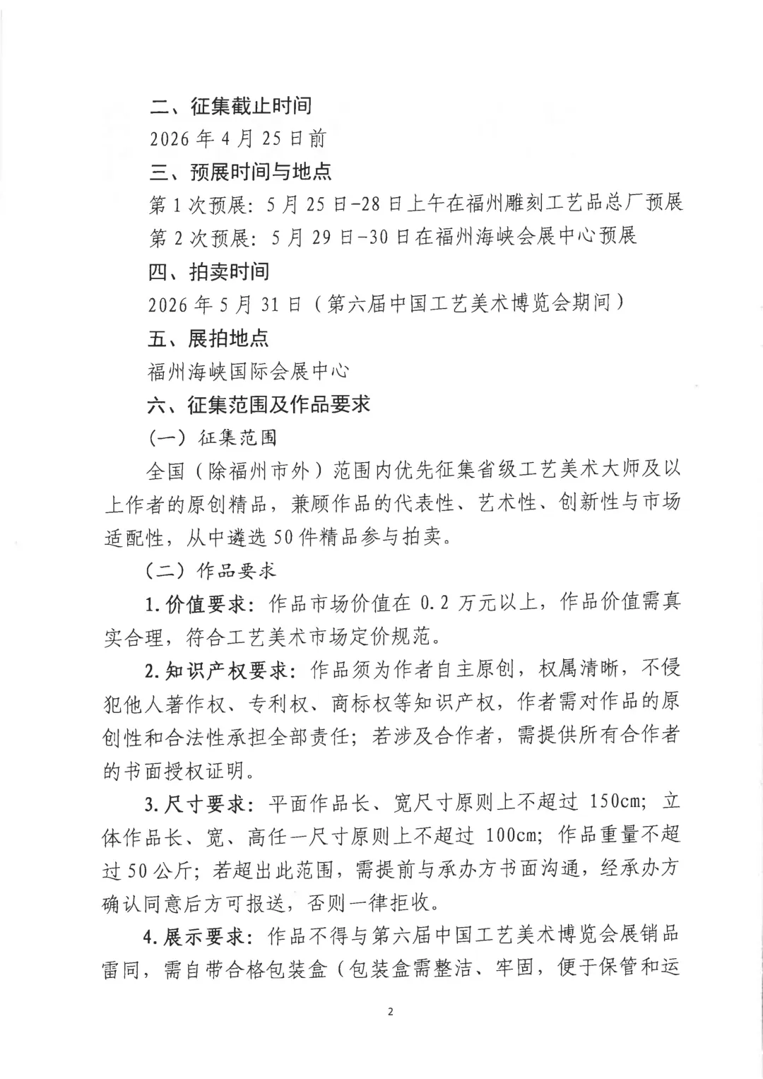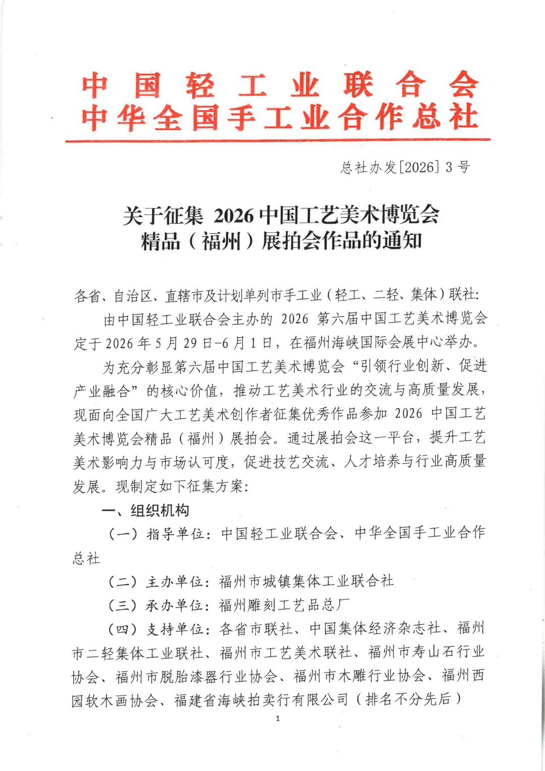 现将《2026 中国工艺美术博览会精品(福州)展拍会作品征集通知》转发给你们,本次展拍会将于