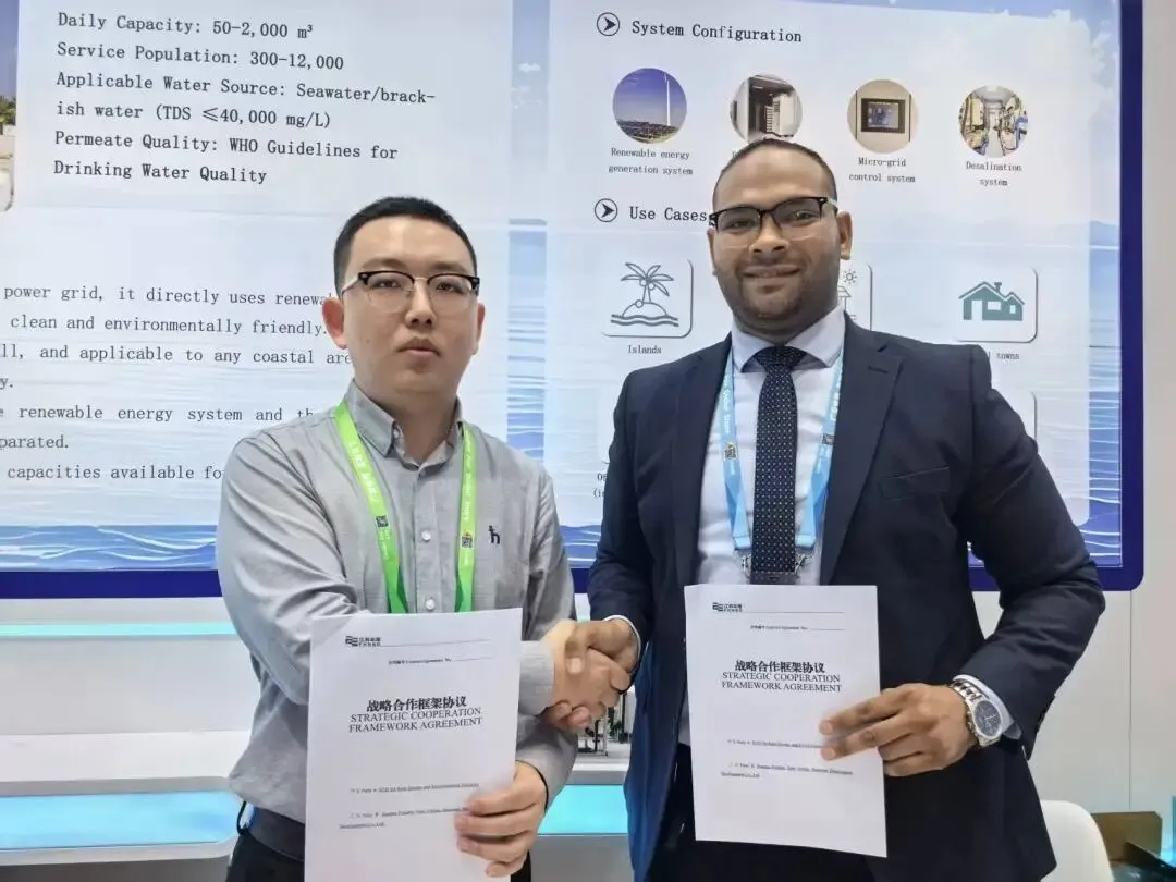 公司在参展期间重点展示了自主研发制造的新能源集装箱式海水淡化装备,该装备凭借绿色低碳、灵活高效、运输便捷的独特优势,吸引了众多采购商开展深度洽谈。工作人员从产品技术参数、应用场景到合作模式,逐一回应采购商的问询,用专业与诚意搭建起高效沟通的桥梁。依托优质产品与专业服务,公司已与多批境外客户达成合作意向,并与埃及客户现场签署战略合作协议,共同推进新能源海水淡化项目落地。