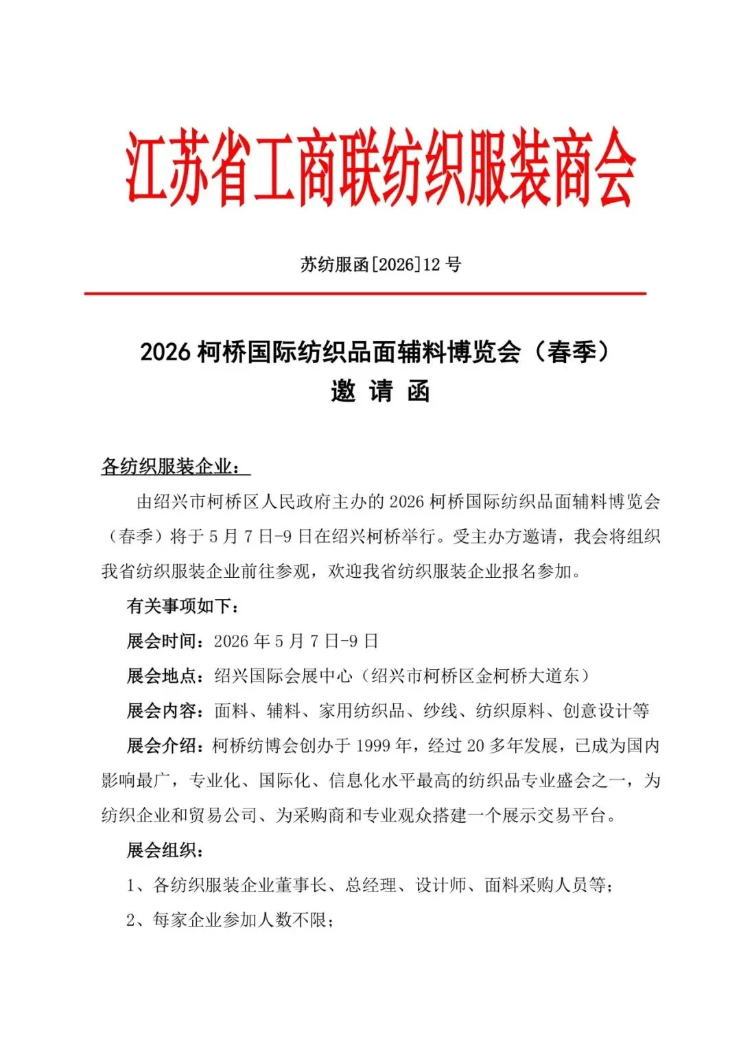 由绍兴市柯桥区人民政府主办的2026柯桥国际纺织品面辅料博览会(春季)将于5月7日-9日在绍兴柯桥举行。受主办方邀请,我会将组织我省纺织服装企业前往参观,欢迎我省纺织服装企业报名参加。