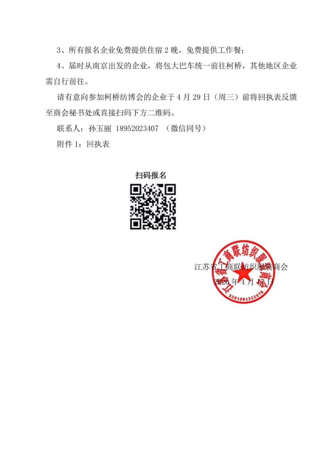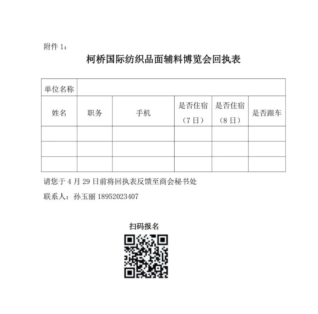 请有意向参加柯桥纺博会的企业于4月29日(周三)前将回执表反馈至商会秘书处或直接扫码下方二维码。