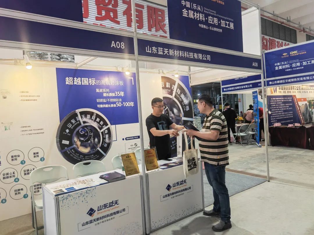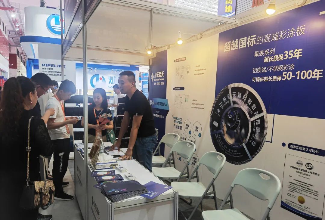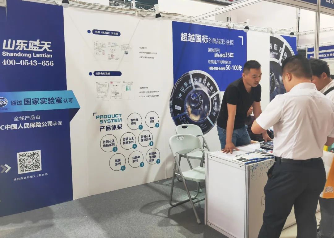 本次展会中山东蓝天展示的丝绸之美®抗菌彩涂板、抗静电彩涂板、氟碳系列彩涂板、蓝韵®精品建筑彩涂板等样板,吸引了不少企业前来咨询了解。