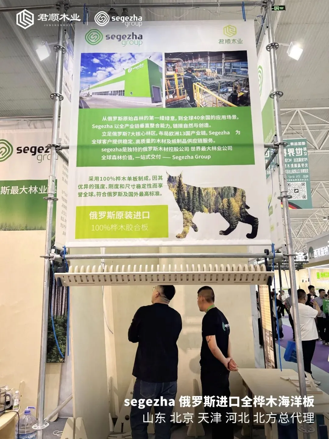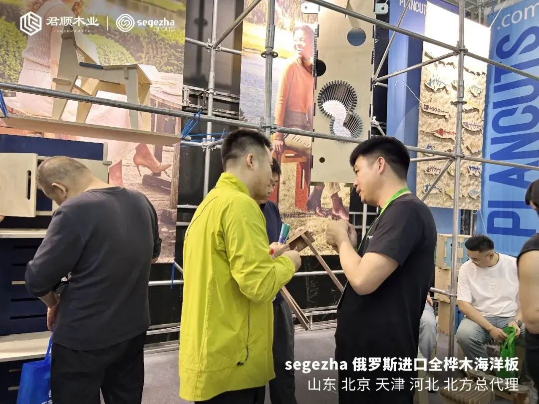 在整个展位设计上,君顺木业没有堆砌过多产品线,而是聚焦于俄罗斯Segezha全桦海洋板这一核心品类。从4mm到40mm的厚度,从标准2440mm到3050mm的长度,从B/BB到CP/CP的等级,展台上每一块板都标注清晰,参观者可以直观对比。