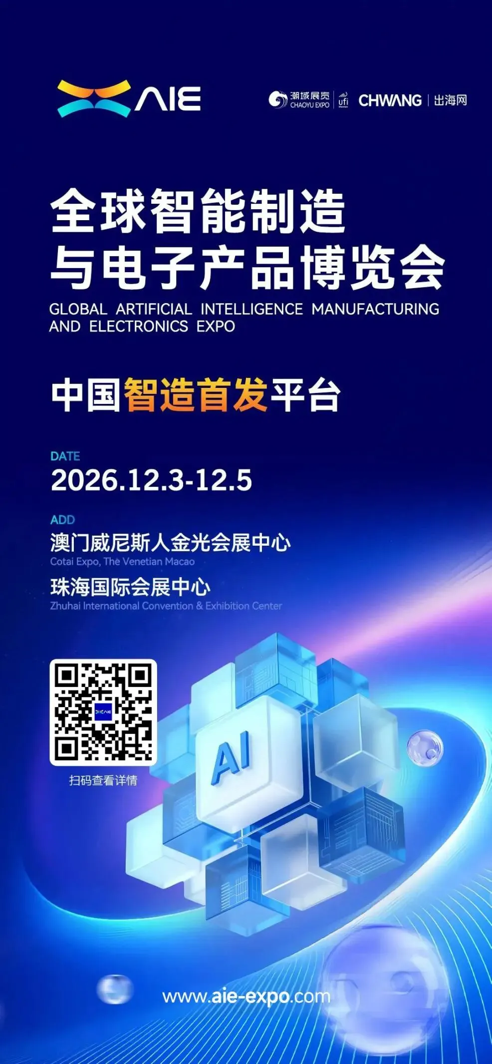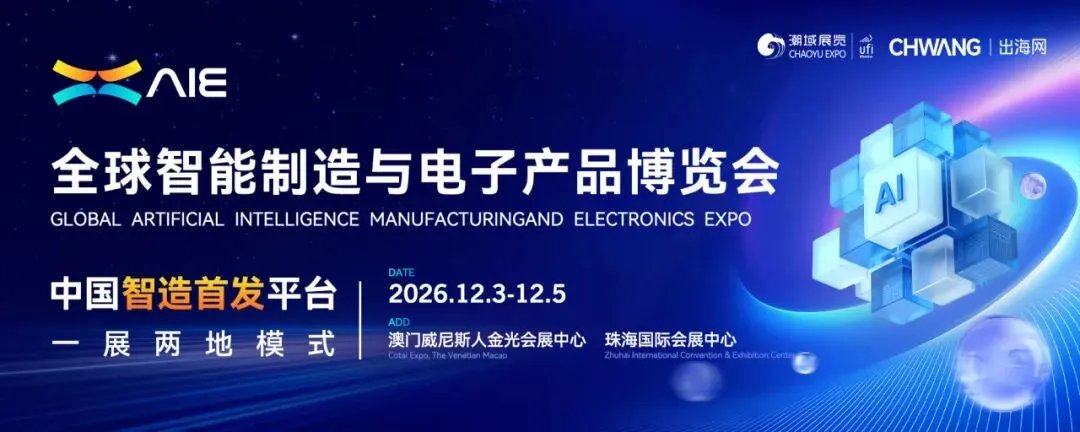 在今年的12月3日-5日,2026全球智能制造与电子产品博览会 (AIE) 也将以“一展两地、论坛引领、科技展示、贸易对接”为核心特色,汇聚全球顶尖的智能装备、工业互联网及消费电子企业,集中展示前沿技术成果与产业应用场景。欢迎企业报名参展!