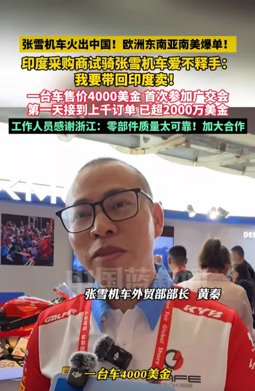 一位来自印度的采购商试骑完爱不释手,直呼“我要带回印度卖!”。据张雪机车外贸部部长黄秦介绍,一台机车的价值在4000美金,当日接到的订单已超过2000万美金,大部分来自欧洲、东南亚、南美。