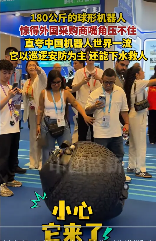 此外,还有伽利略、宇树等四足机器人展示爬坡、越障、负重(170kg),适配工业巡检、安防救援。现场一180公斤的球形机器人重量虽大,但其灵活走位也吸引了不少海外采购商的注意力。