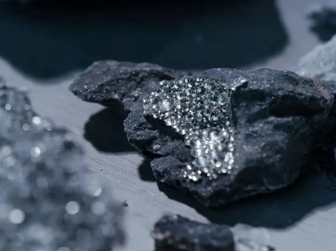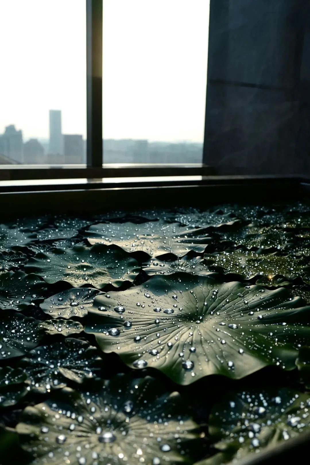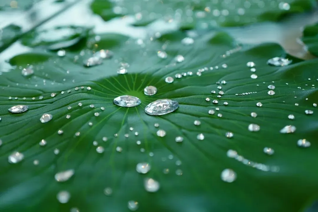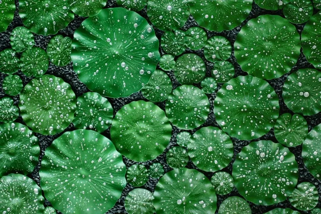 在作品《露珠》中,艺术家用水钻比作露珠散落在荷叶上,闪烁着光芒的荷叶漂浮于水中,从观众对其的观感互动一并完成这装置性的艺术探讨。钻石来源于自然,把它归还于自然,是这组作品的初衷。