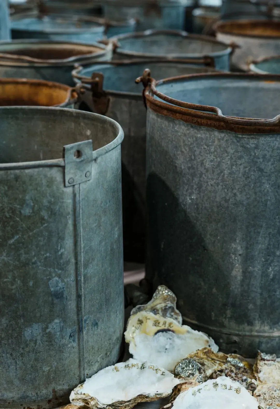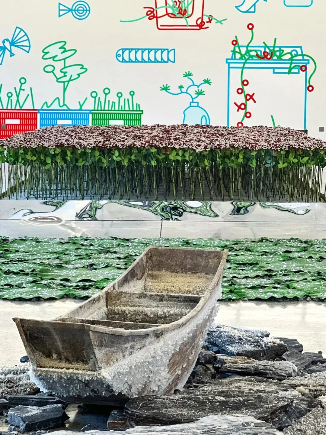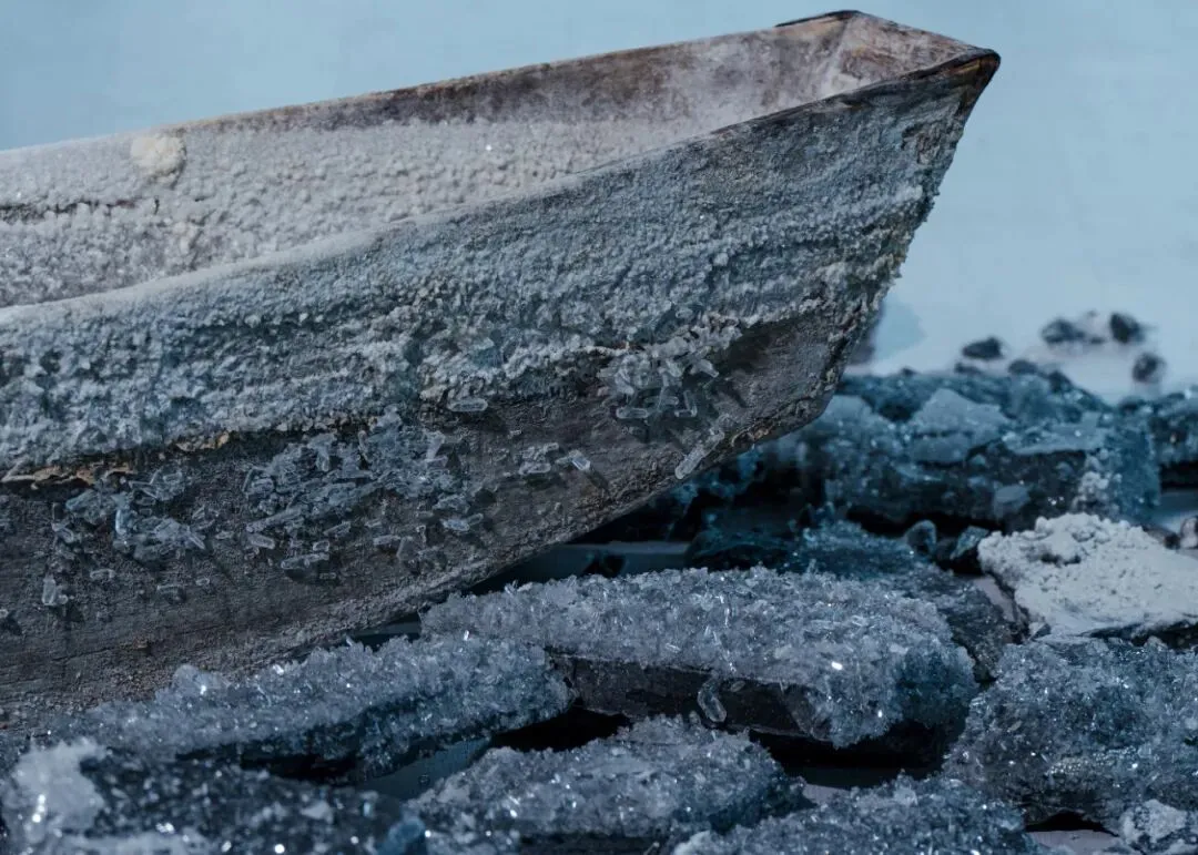 一艘海上遗弃的木船,成为展览的开篇。它孤立的搁浅在石块之中,仿真水钻和贝壳仿佛生长的晶体遍布其间。而在它之后,一条像是船队的阵列,为我们铺陈了时间的海洋。“海”在佘海晴的作品中构成了某种时间与距离的意象。
