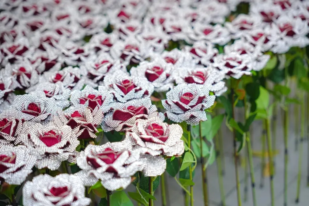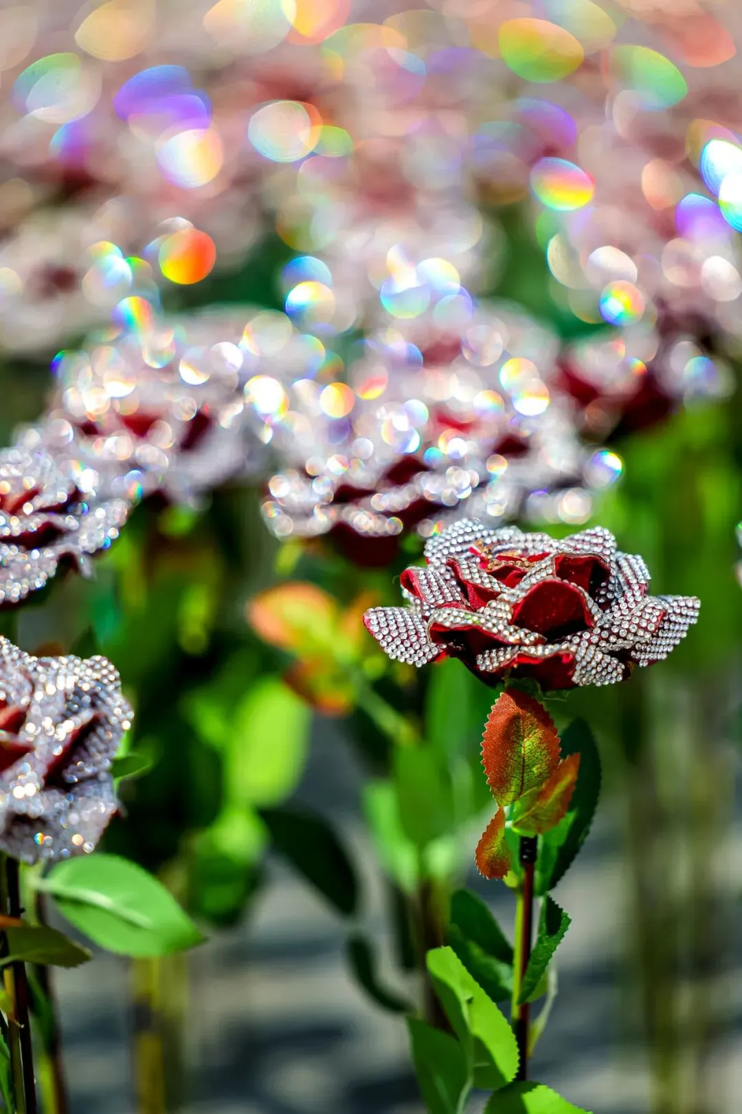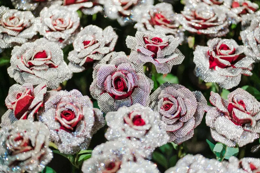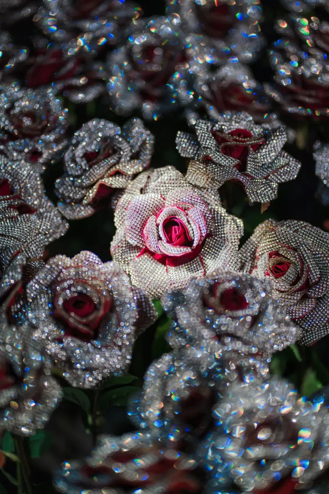 在作品《钻石玫瑰》中,艺术家用水钻覆盖的玫瑰安插在不同的环境当中,从观众对其的观感互动一并完成这装置性的艺术探讨。钻石来源于自然,把它归还于自然,是这组作品的初衷。让自然中的“玫瑰”佩戴着闪耀的“珠宝”,不仅是对大自然的歌颂,同时也是对观众的提问,当这些“钻石玫瑰”被安插于自然界中,观众也许会产生关于虚实的疑问,究竟这是否真的花、真的玫瑰、真的钻石?而种种的疑问,会因为场地的改变而变化,置身于此地将给人以虚幻的假象,产生真假矛盾的思考。