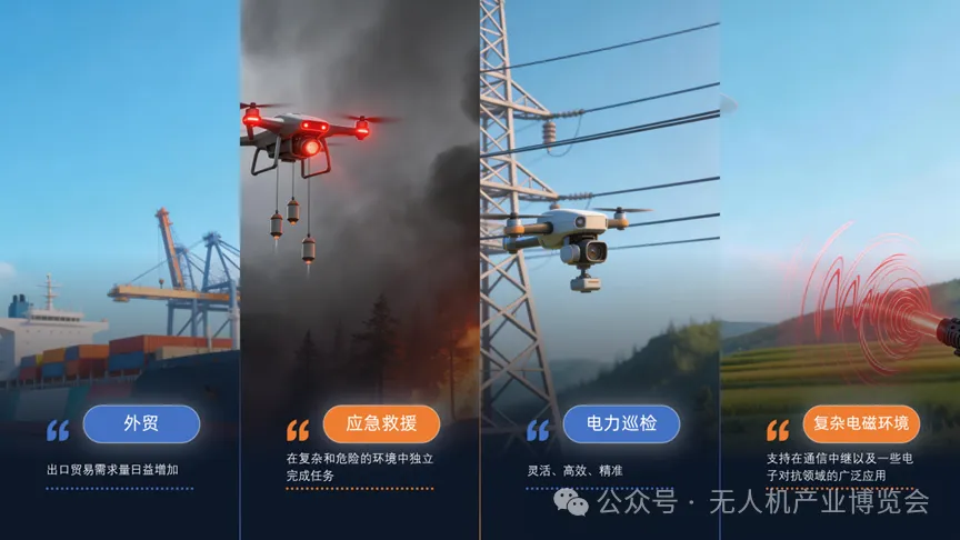 应用场景:外贸、应急救援、电力巡检、信号中继,以及一些复杂电磁环境领域。