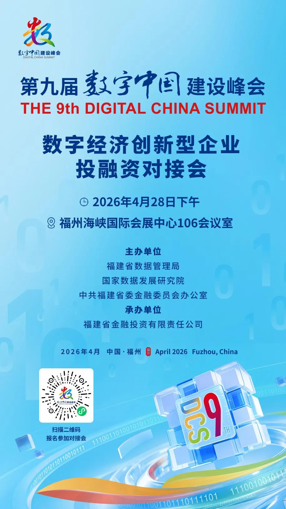 作为峰会重要配套活动,数字经济创新型企业投融资对接会将于4月28日下午在福州海峡国际会展中心106会议室举办。