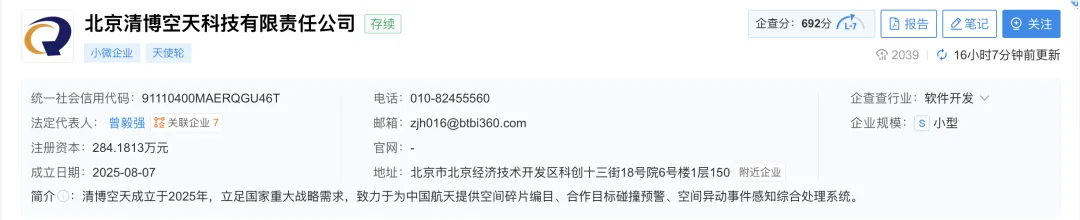 据企查查获悉,2026年4月17日,北京清博空天科技有限责任公司(以下简称:空天科技)完成天使轮融资,本轮投资方为麟阁创投,融资金额超千万。