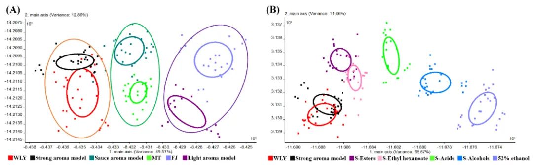 同时,该研究利用浓香型白酒主体香型骨架成分等的模拟酒体系以及己酸乙酯与乙醇的两相系统等,发现了白酒中的脂肪酸酯类成分对MOS响应的贡献度最大,最后通过特异性的传感器信号实现了不同香型白酒、不同品牌浓香型白酒的科学区分。