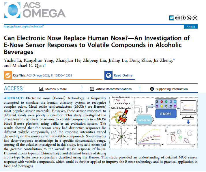 近期,五粮液风味研究团队在美国化学会主办的知名期刊《ACS Omega》以封面文章的形式发表了研究文章《Can electronic nose replace human nose?-An investigation of Enose sensor responses to volatile compounds in alcoholic beverages“电子鼻能代替人类的鼻子吗?关于电子鼻传感器对酒精性饮料中挥发性成分响应的研究”》(全文链接:https://pubs.acs.org/doi/10.1021/acsomega.3c01140)。